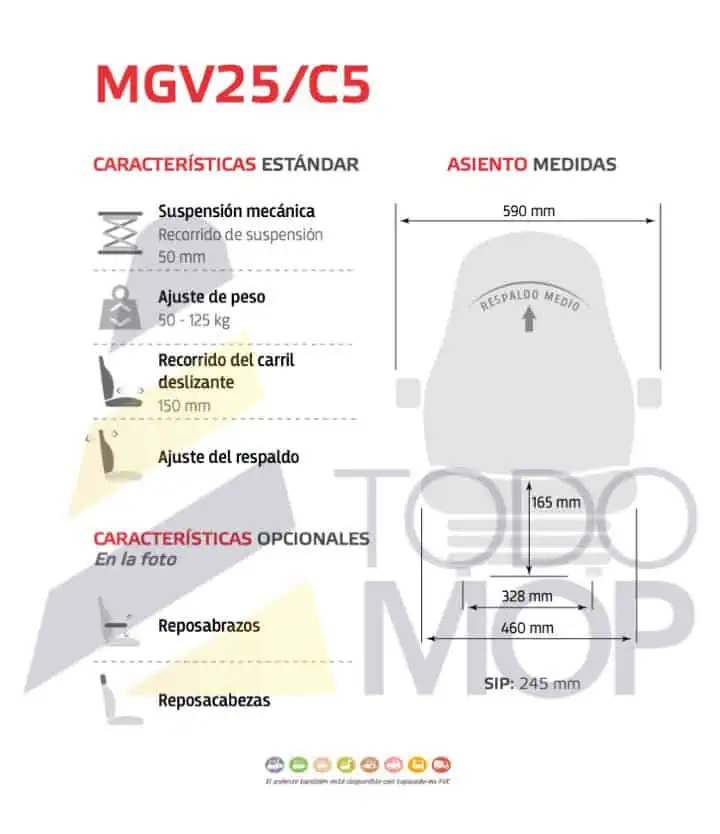 Asiento de Suspensión MGV25/C5, asiento compacto UNITEDSEATS ideal para tractores y maquinaria pequeña. Con suspensión mecánica, ajuste de peso y recorrido, asegura un viaje cómodo y estable. Disponible en tela o PVC resistente al agua. Un asiento de 460 mm de ancho, resistente y fácil de instalar.